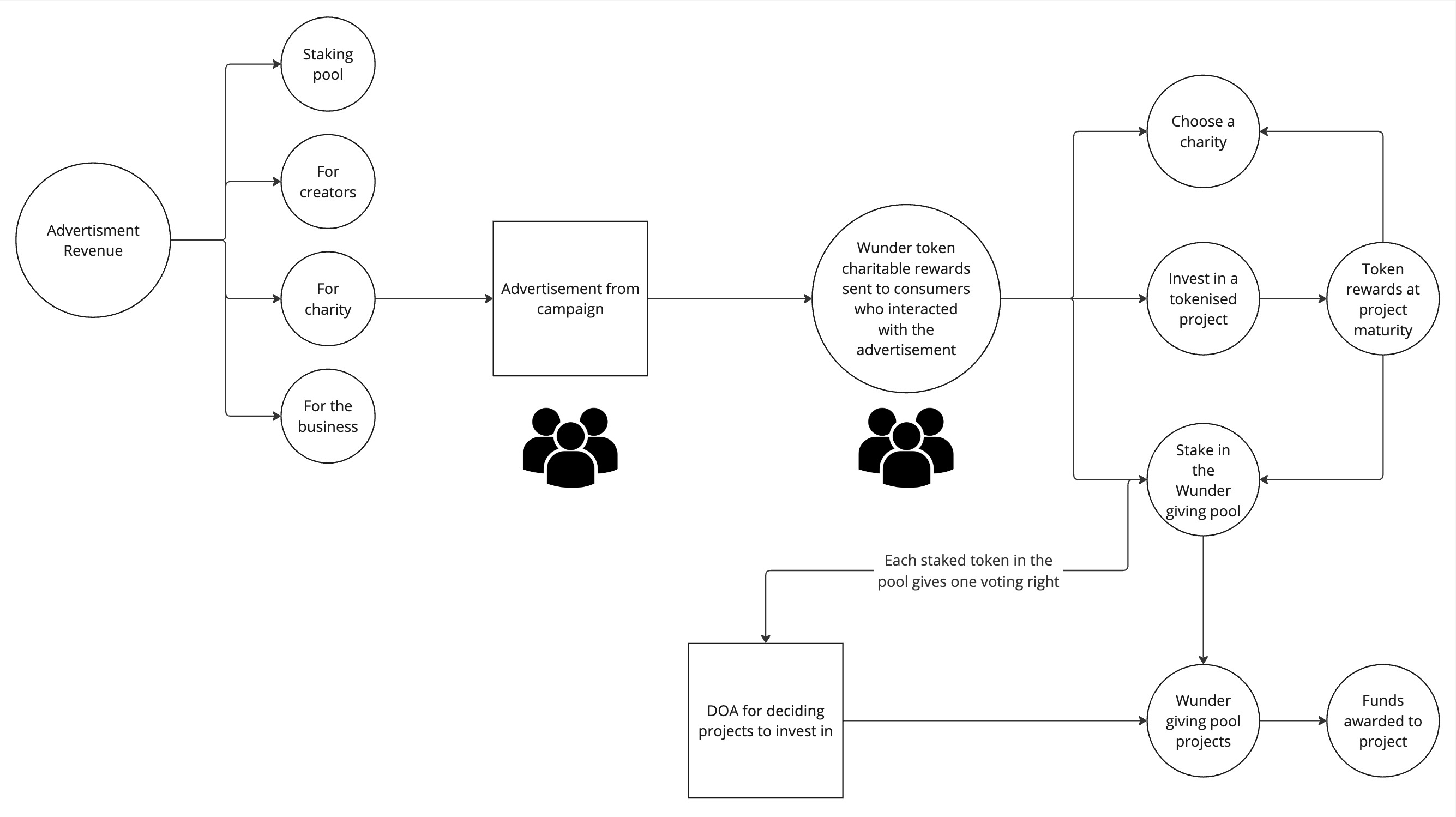 Once a user signs up, they will automatically be assigned an on chain wallet. Through advertising, a percentage of the revenue is assigned and given over to the Wunder charitable token wallet. As users consume the advertisements organically in their feeds, a smart contract logs their interactions with the content, and rewards them directly into their Wunder Wallet. Each user then has the choice on how they want to use their awarded tokens. for more information on the usage model please refer to the [social media for social good](https://wunder-1.gitbook.io/wunder/overview/social-media-2.0-1) page.